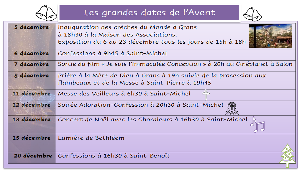 Mercredi 24 décembre : 17h Saint Laurent, 17h15 Saint Michel, 18h Saint benoit, 19h Bel air, 23h Saint Laurent, 23h Grans.